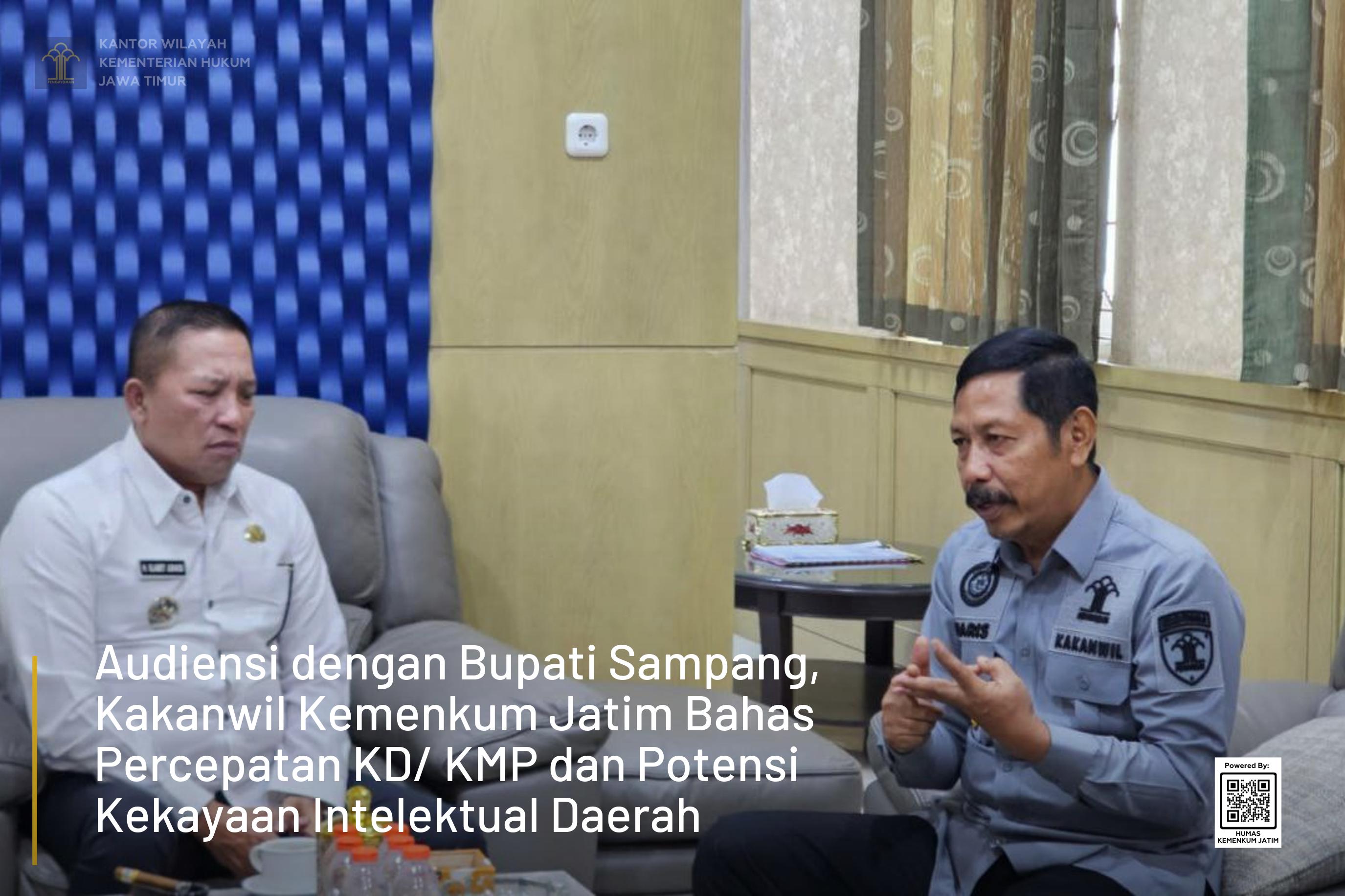 SAMPANG – Kepala Kantor Wilayah Kementerian Hukum Provinsi Jawa Timur, Haris Sukamto, melakukan audiensi dengan Bupati Sampang, Slamet Junaidi, pada Selasa (17/6/2025) di Pendopo Kabupaten Sampang. Pertemuan ini membahas sejumlah isu strategis di bidang pelayanan hukum, khususnya percepatan pendirian Koperasi Desa/ Kelurahan Merah Putih (KD/ KMP) dan penggalian potensi kekayaan intelektual lokal.