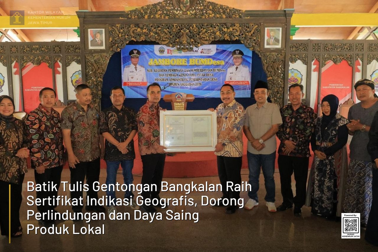 Bangkalan - Pengakuan terhadap kekayaan intelektual daerah kembali ditandai dengan penyerahan sertifikat Indikasi Geografis (IG) untuk Batik Tulis Gentongan Tanjung Bumi Bangkalan yang berlangsung di Pendopo Bupati Kabupaten Bangkalan pada Kamis, (23/04). Penyerahan ini dihadiri oleh Kepala Divisi Pelayanan Hukum Raden Fadjar Widjanarko, Bupati Bangkalan Lukman Hakim, serta jajaran terkait.