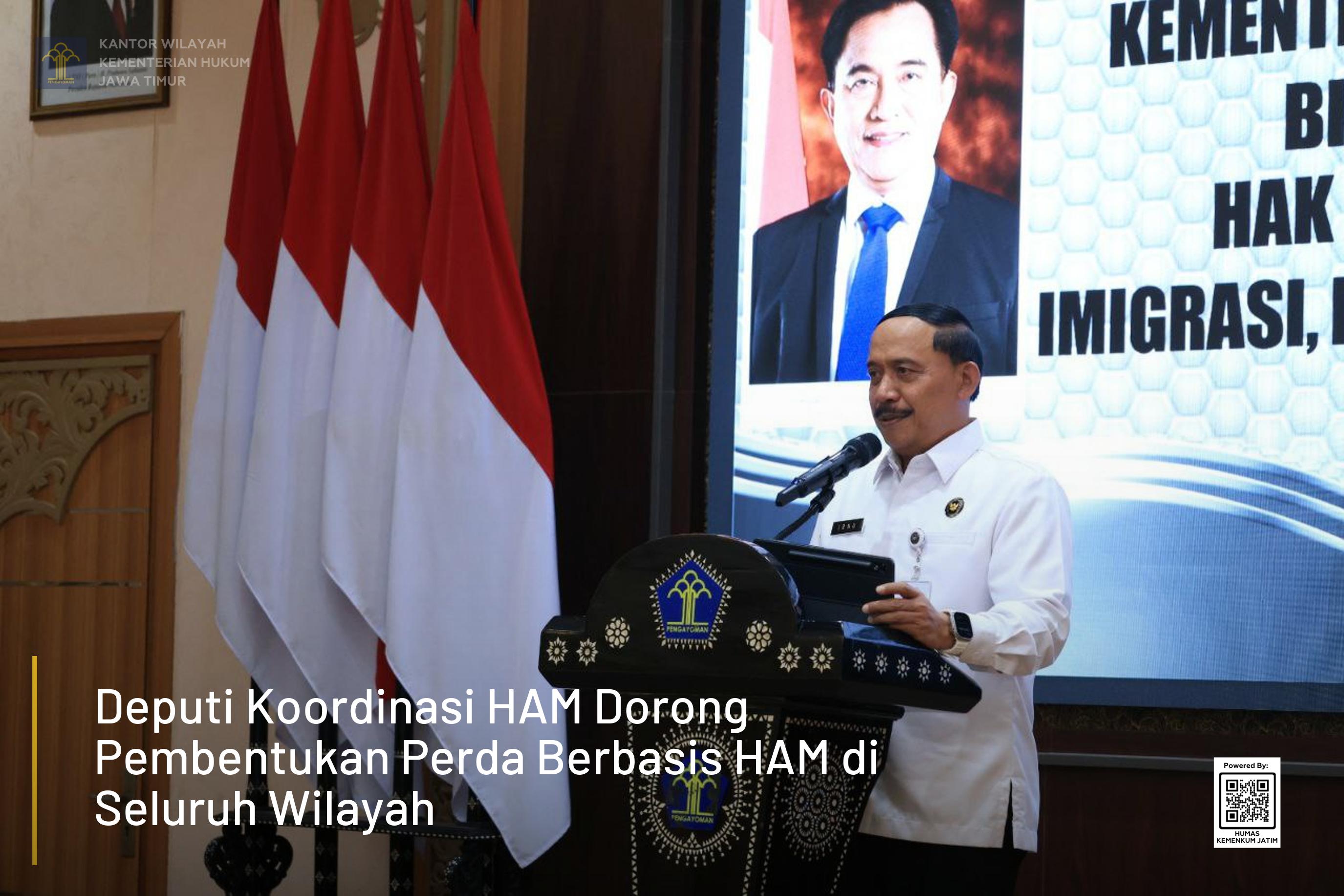 SURABAYA — Deputi Bidang Koordinasi HAM Kemenko Kumhamimipas, Ibnu Chuldun, menegaskan pentingnya memasukkan perspektif Hak Asasi Manusia (HAM) dalam setiap kebijakan dan produk hukum daerah.