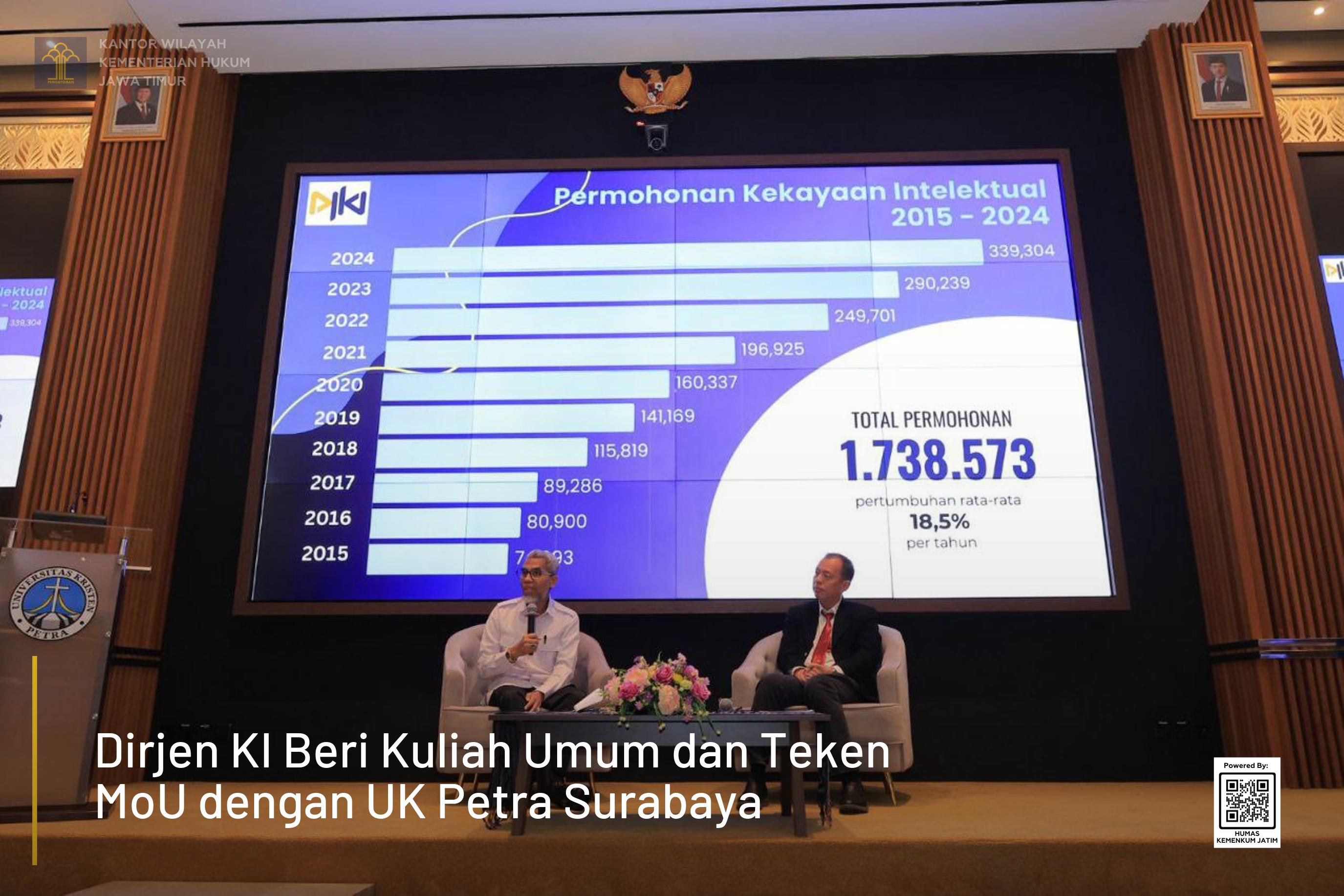 SURABAYA — Direktur Jenderal Kekayaan Intelektual (Dirjen KI) Kementerian Hukum (Kemenkum) RI, Razilu, memberikan kuliah umum sekaligus menandatangani nota kesepahaman (MoU) dengan Universitas Kristen Petra (UK Petra) Surabaya, Rabu (25/6). Acara yang berlangsung di Aula Rektorat UK Petra ini dihadiri oleh lebih dari 100 sivitas akademika dan turut didampingi oleh Kepala Kantor Wilayah Kemenkum Jatim, Haris Sukamto, serta Kepala Divisi Pelayanan Hukum, Raden Fadjar Wijanarko.