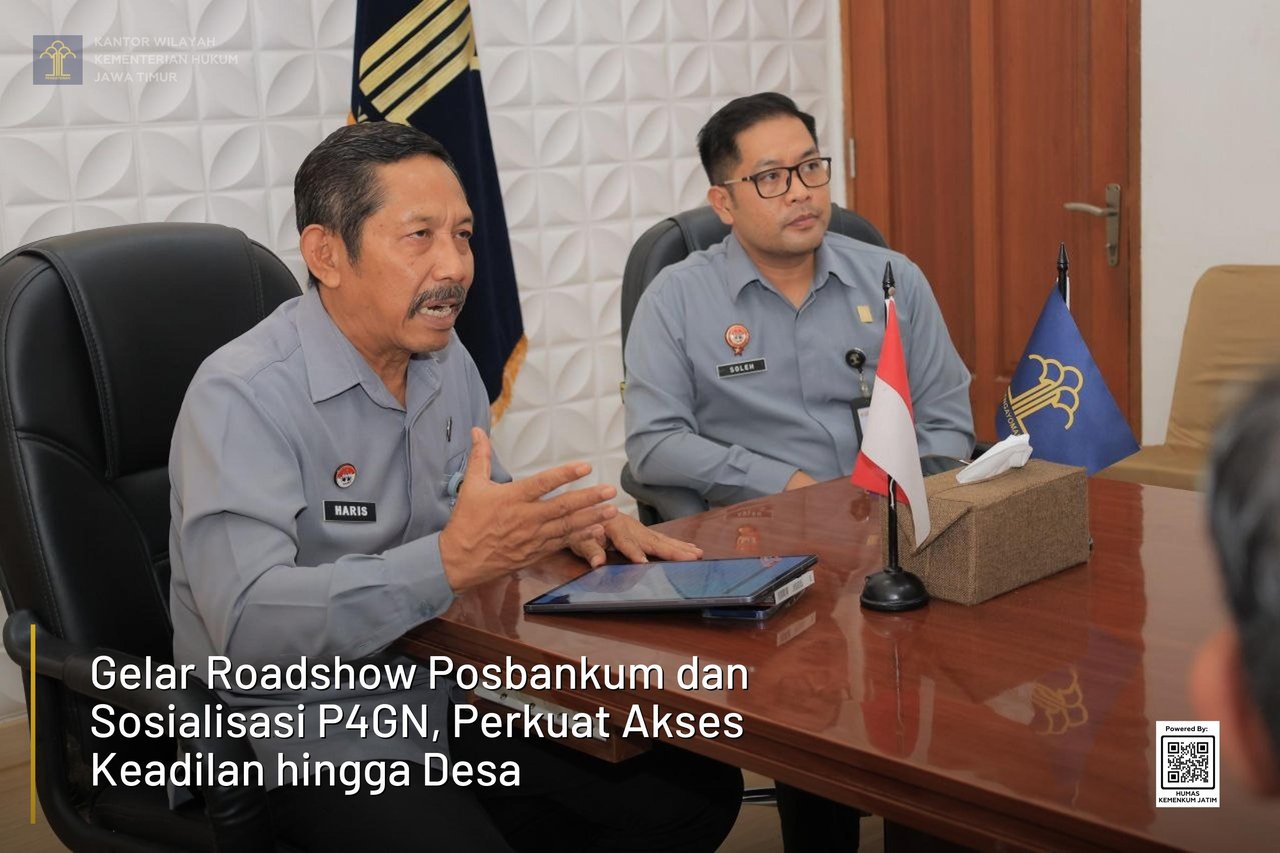 Surabaya - Kantor Wilayah Kementerian Hukum Jawa Timur menggelar roadshow pembinaan dan pendampingan Pos Bantuan Hukum (Posbankum) sekaligus sosialisasi Pencegahan dan Pemberantasan Penyalahgunaan dan Peredaran Gelap Narkotika (P4GN), Selasa (28/4). Kegiatan ini menjadi langkah strategis untuk memperkuat akses keadilan serta meningkatkan kesadaran hukum masyarakat hingga ke tingkat desa dan kelurahan.