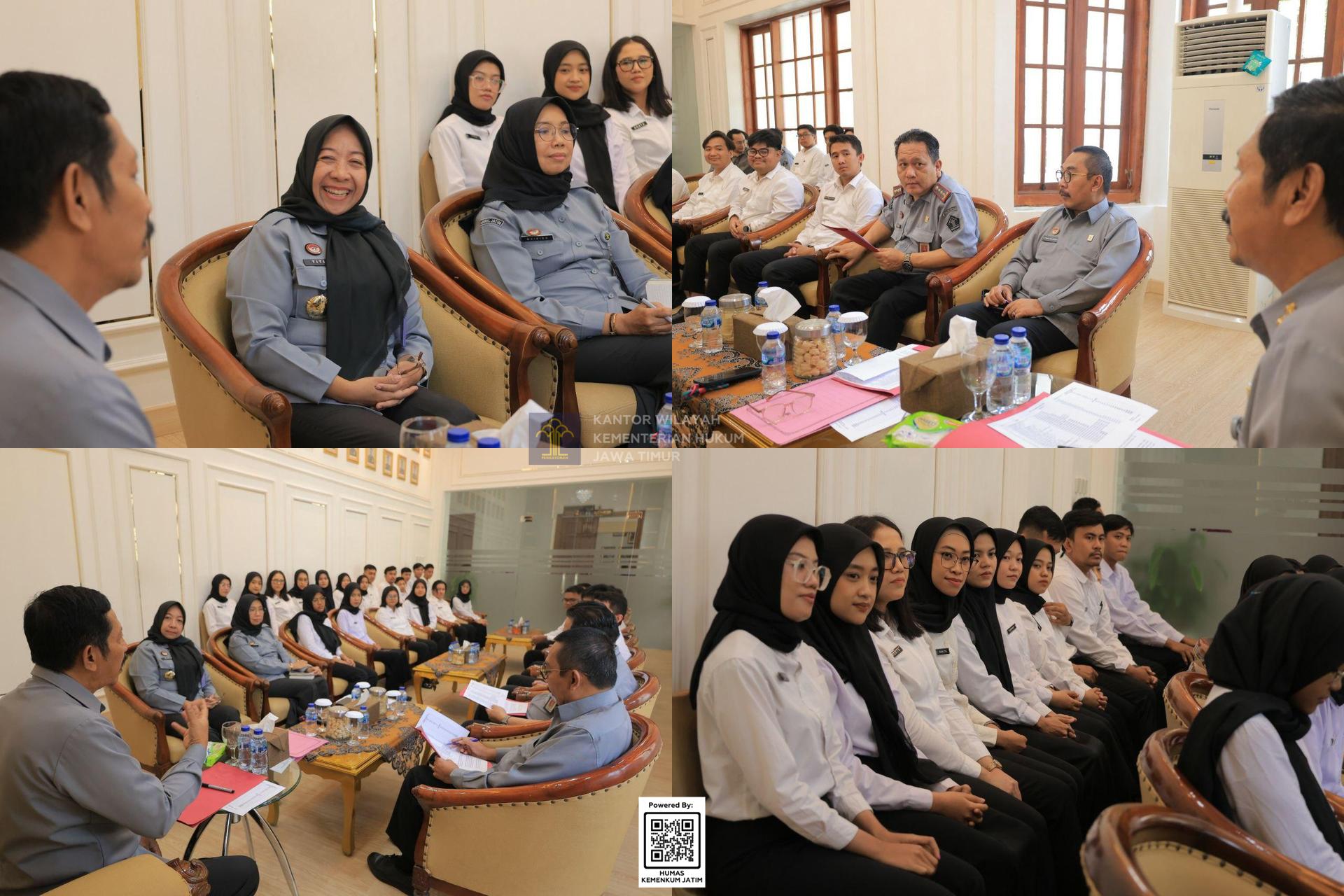 Surabaya, 30 Juni 2025 – Kepala Kantor Wilayah Kementerian Hukum (Kemenkum) Jawa Timur, Haris Sukamto, memberikan pengarahan kepada 29 CPNS dari lingkungan Kanwil dan Balai Harta Peninggalan (BHP). Kegiatan dilaksanakan di Ruang VIP Kanwil, dengan rincian peserta terdiri dari 20 CPNS dari Kanwil dan 9 dari BHP.