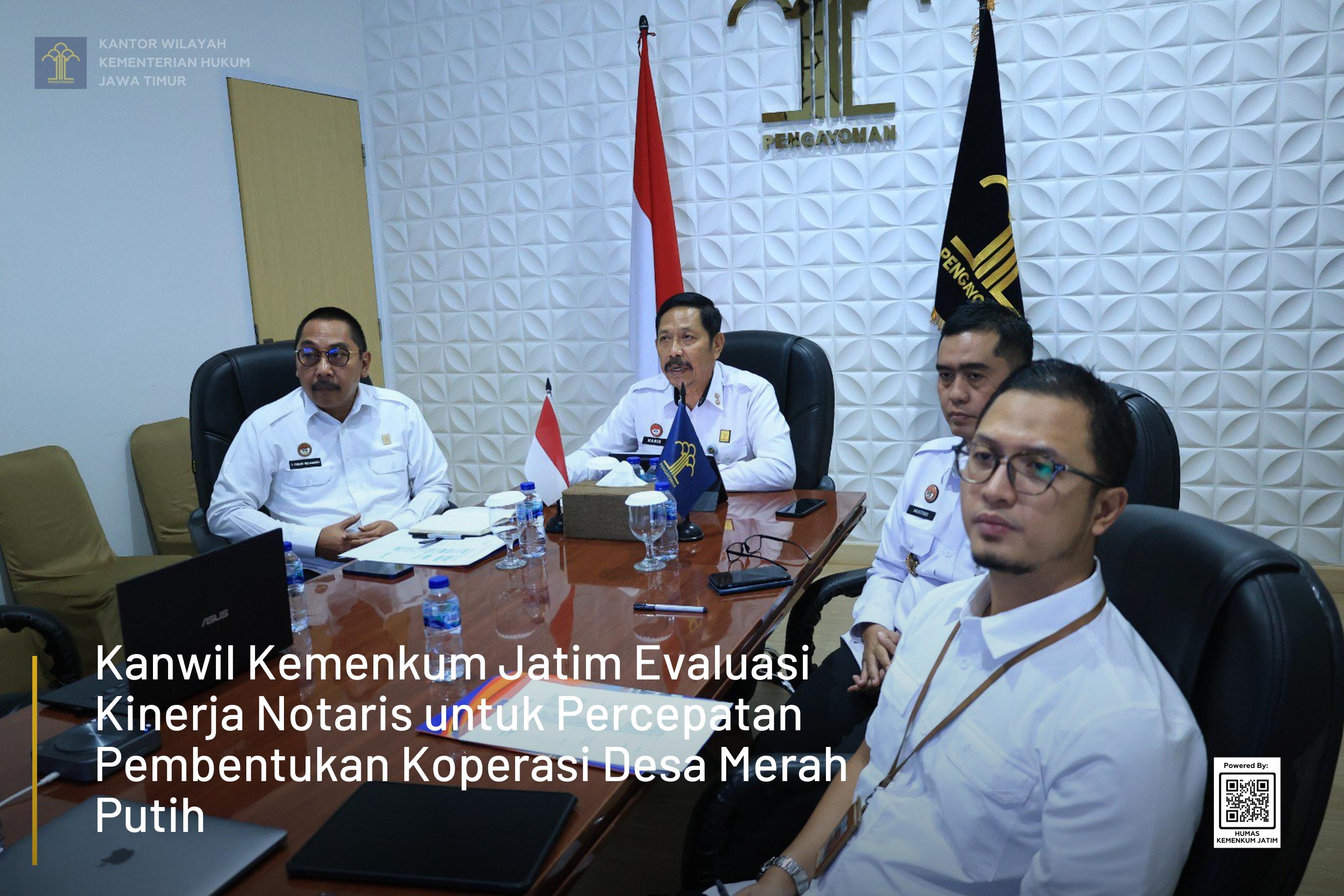SURABAYA — Kantor Wilayah Kementerian Hukum Jawa Timur menggelar kegiatan Monitoring dan Evaluasi Kinerja Notaris dalam rangka mendukung percepatan pembentukan Koperasi Desa/Kelurahan Merah Putih (KD/KMP), Rabu (18/6).