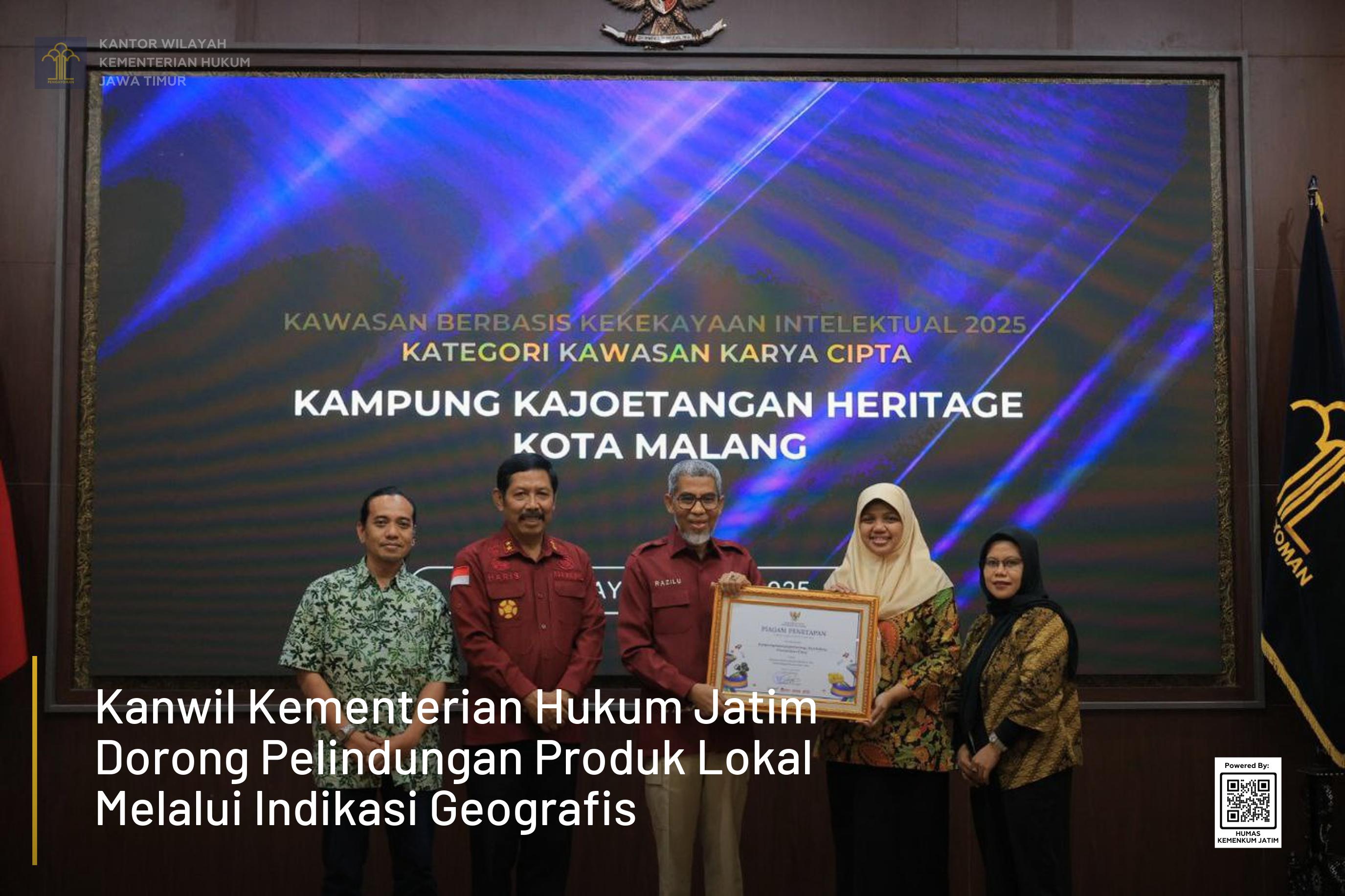 Kepala Kanwil Kemenkum Jawa Timur, Haris Sukamto, menegaskan pentingnya pelindungan terhadap produk-produk unggulan berbasis wilayah agar dapat meningkatkan daya saing dan kesejahteraan masyarakat.