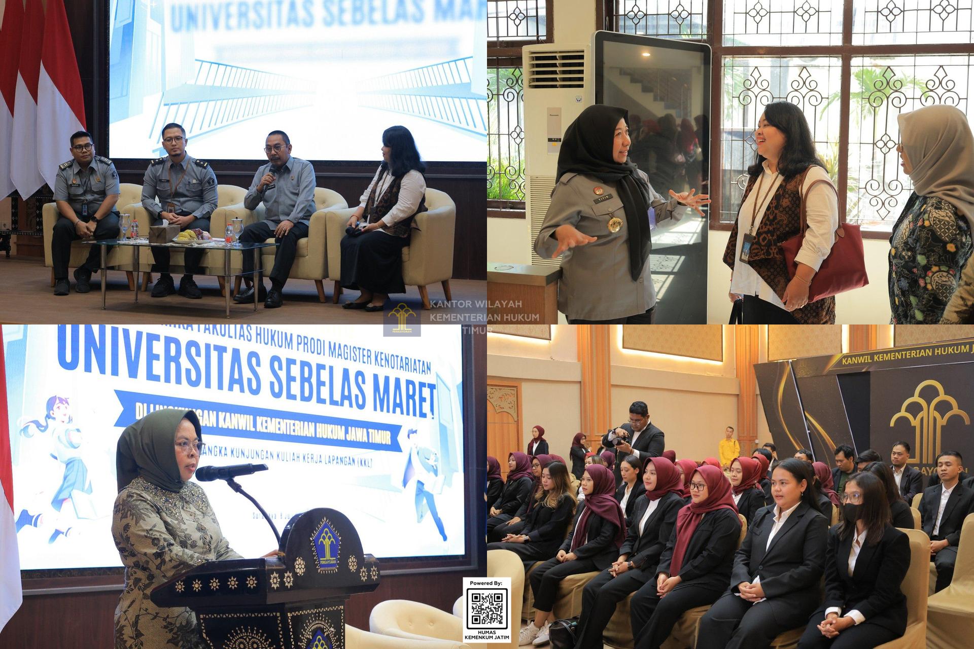 Surabaya - Kantor Wilayah Kementerian Hukum (Kemenkum) Jawa Timur menerima kunjungan akademik dari 70 mahasiswa Program Studi Magister Kenotariatan Fakultas Hukum Universitas Sebelas Maret (UNS) Surakarta. Kegiatan yang berlangsung di Aula Raden Wijaya tersebut diisi dengan pemaparan materi, dialog interaktif, dan sambutan dari pimpinan instansi serta civitas akademika.
