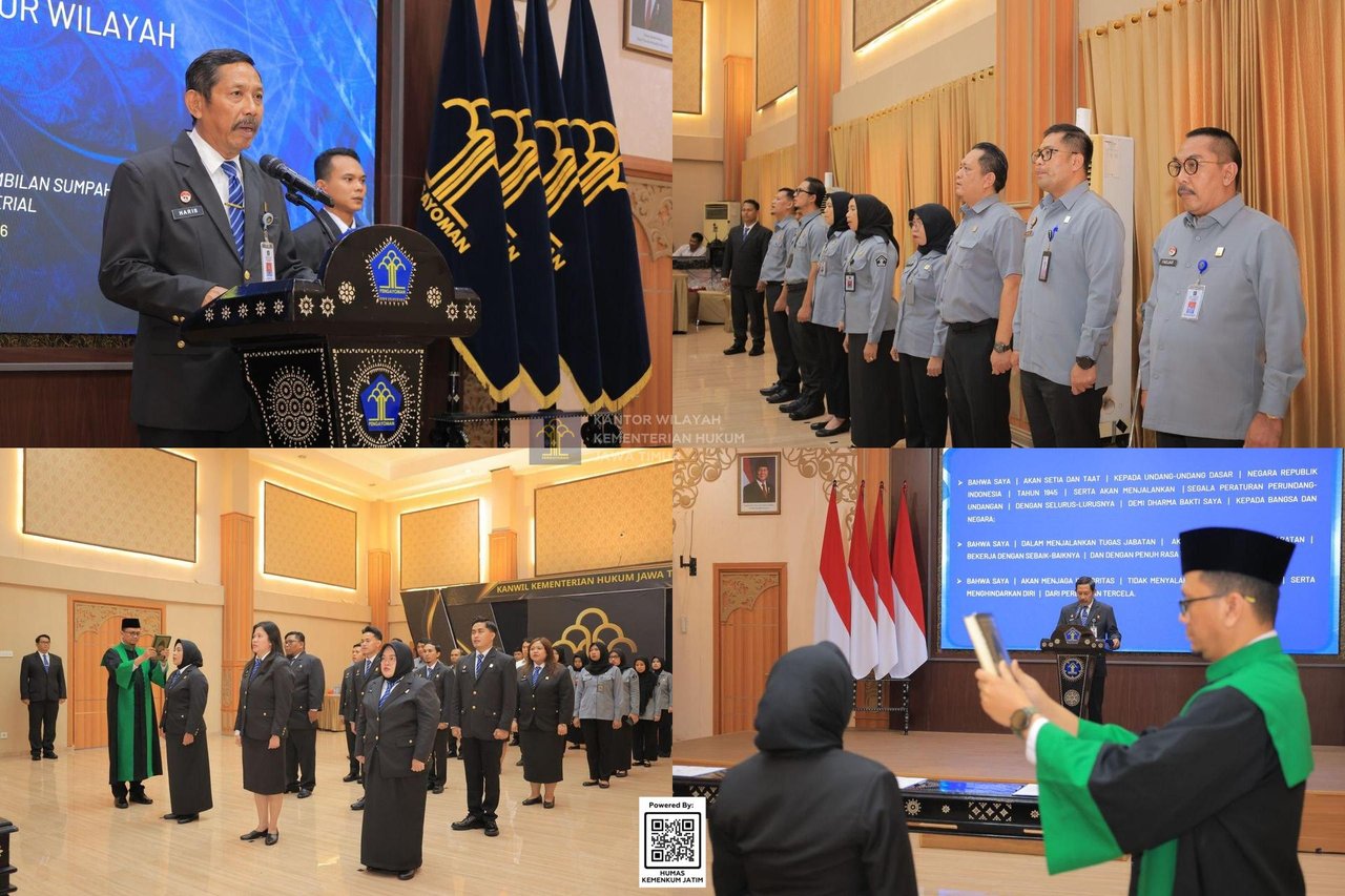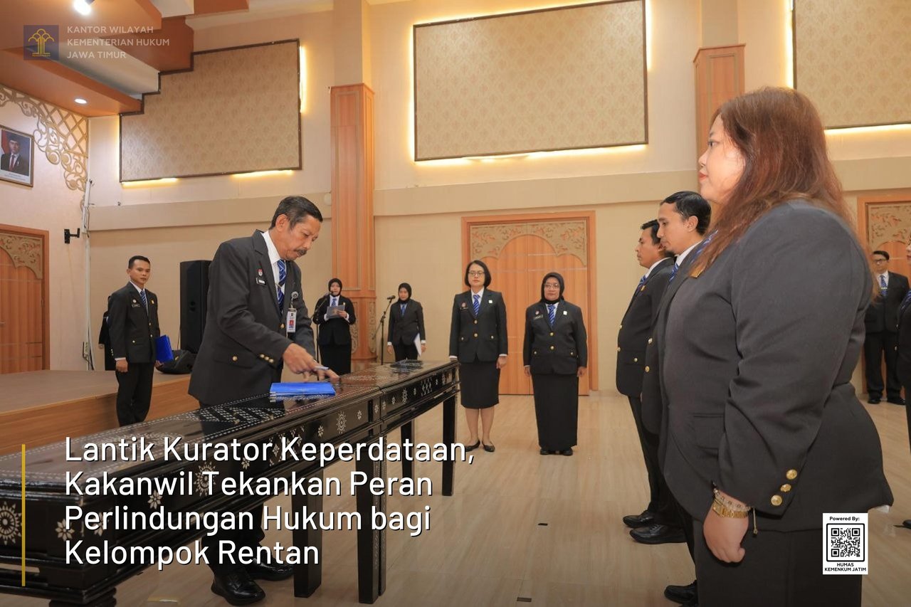 Surabaya - Kantor Wilayah Kementerian Hukum Jawa Timur melantik pejabat fungsional kurator keperdataan dalam sebuah upacara yang digelar di Aula Raden Wijaya, Selasa (28/4). Pelantikan yang dipimpin langsung Kepala Kanwil Kemenkum Jatim, Haris Sukamto, tersebut menjadi momentum penguatan peran kurator keperdataan dalam memberikan perlindungan hukum, khususnya bagi kelompok rentan yang membutuhkan kepastian dan keadilan dalam berbagai persoalan keperdataan.