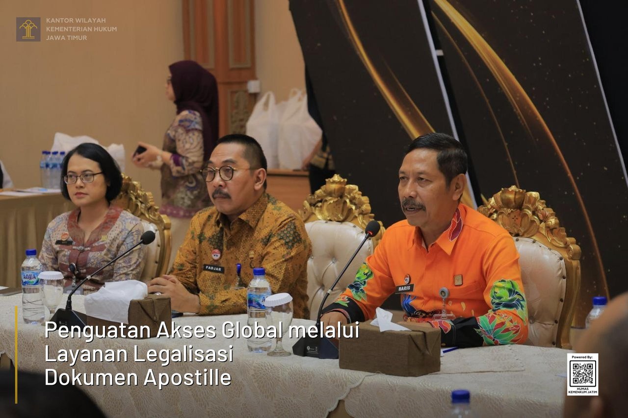 Surabaya - Akses masyarakat menuju pengakuan dokumen di tingkat internasional terus diperkuat melalui sosialisasi layanan legalisasi dokumen publik yang digelar di Aula Raden Wijaya, Kamis (9/4). Kegiatan ini menjadi bagian penting dalam meningkatkan pemahaman masyarakat terhadap layanan Apostille sebagai bentuk transformasi birokrasi yang lebih sederhana, cepat, dan akuntabel.