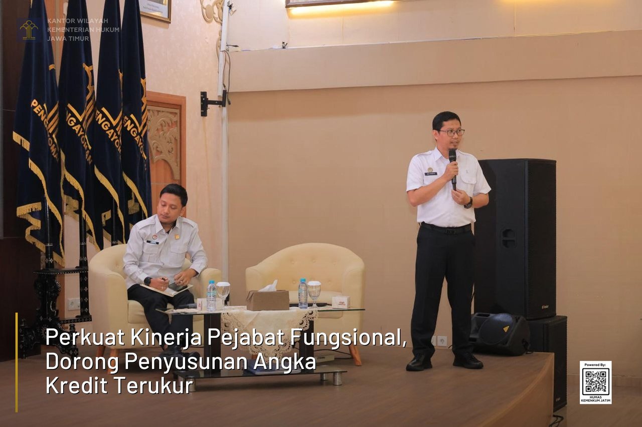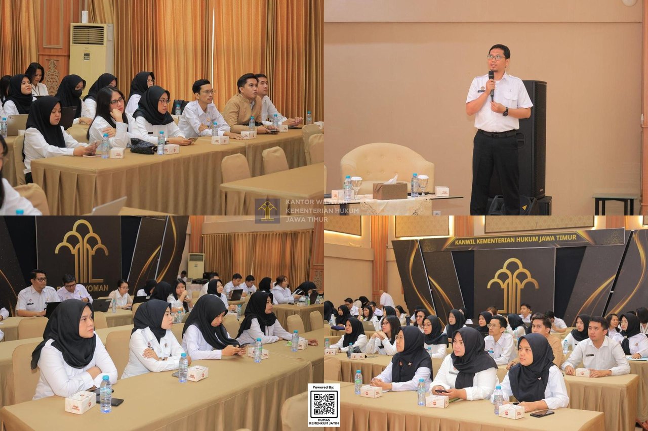 Surabaya - Upaya memperkuat kualitas kinerja yang terukur terus dilakukan Kantor Wilayah Kementerian Hukum Jawa Timur melalui pendalaman materi penetapan angka kredit jabatan fungsional pada hari kedua kegiatan sosialisasi dan rekonsiliasi yang digelar di Aula Raden Wijaya, Rabu (15/4). Kegiatan ini menjadi bagian penting dalam mendorong pejabat fungsional agar mampu menyusun angka kredit yang tidak hanya tepat, tetapi juga mencerminkan dampak nyata dari kinerja.